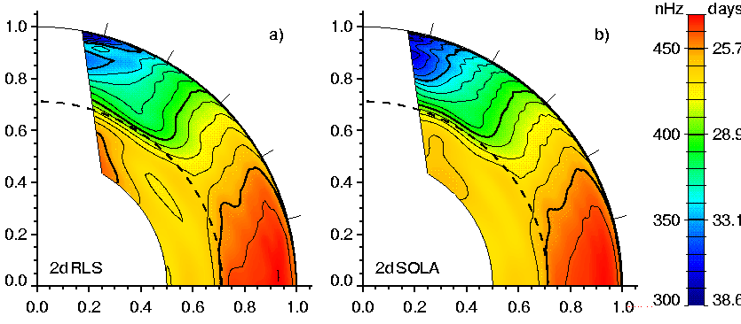 The resulting convection is highly time dependent and the flows are intricate. Figures 1b,c show properties of the resulting global-scale convection, and these are very encouraging when we consider the puzzle raised by helioseismology. In particular, Figure 1a contrasts the latest deductions about internal rotation rates obtained from an inversion of GONG helioseismic data (and Figures 2a,b in turn from SOI-MDI) with the time-averaged mean angular velocity obtained from the ASH simulation (Figure 1b). For the first time we are finding in these simulations, much as in the helioseismic inversion, that the angular velocity Omega is nearly constant on radial lines throughout much of the convection zone at mid latitudes, and that there is a systematic decrease of rotation rate with latitude in going from the equator to the poles (Elliott et al. 1998). In turning to the convective patterns, Figure 1c shows much less evidence of the earlier banana cells when viewing radial velocities near the top of the spherical shell. The convection is now dominated by intermittent plumes of upflow and stronger downflow, some possessing a distinctive cyclonic swirl, although there is still some semblance of north-south alignment of structures in the equatorial region. Most previous models yielded a fast polar vortex, in addition to Omega constant on cylinders aligned with the rotation axis. The shear layer of angular velocity speedup just below the surface at low to mid latitudes is not realized in our simulations, but that is a likely consequence of supergranulation effects which we currently do not capture. Further, the prominent tachocline at the base of the convection zone (below the dashed curve) is not realized in our simulations since they still operate at Reynolds numbers $R_e$ where viscous coupling can imprint the local rotation rate of the unstable zone upon the stable region. Some theoretical discussions concerning the tachocline (Spiegel \& Zahn 1992; Elliott 1997) invoke strong horizontal viscosity due to anisotropic turbulence in the stable layer to circumvent the diffusive spreading. Other models invoke magnetic fields to enforce solid body rotation in the radiative interior (Gough \& McIntyre 1998). Simulations at higher R_e (requiring greater resolution) and including the effects of magnetic fields can test such theories and provide hope for modelling the tachocline in the near future.